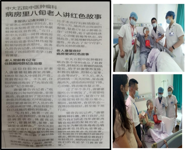 自2021年起,中山大学附属第五医院综合医院中医科面临着定位模糊、服务能力不足等问题,开创性地提出“依托优势学科优化中医学科建设”的全新模式,以“西医优势学科+中医专科”深度融合为突破口,率先将中医科与优势学科肿瘤中心融合,成立中医肿瘤科。通过整合资源、创新管理、培育人才等一系列强有力的举措,在中西医协同发展的道路上大胆探索,为提升医院整体医疗服务水平、满足群众日益增长的健康需求贡献力量。 创新探索“党建+中医药”工作项目的主要内容和做法 (一)强化顶层设计,筑牢思想根基 医院明确“依托肿瘤中心优势,打造中西医协同旗舰科室”的发展方向,构建起“党建+业务”双轮驱动的长效机制。常态化开展“中医药文化进支部”主题活动,组织党员医护深入学习《中医药发展战略规划纲要》,强化使命担当意识。在科室关键岗位设立党员先锋岗,由党员专家带头攻克疑难病例,推动中西医结合诊疗方案精准落地实施,充分发挥党员在业务工作中的模范带头作用。 (二)构建深化“党建+中医药”工作项目策略 1.工作思路 学科融合与定位:深度推进优势学科融合,明确以肿瘤诊疗为核心发展方向,借助肿瘤中心的丰富资源,大力开展中西医结合诊疗服务,实现优势互补。 人才队伍建设:积极引入肿瘤学专家担任学科带头人,推动医务人员“西学中”转型,同时大力培育中医专业人才及博士后,全面提升团队整体素质。 服务模式创新:推行“大门诊、小住院”模式,设置多个专科门诊,满足患者多元需求;住院部则专注于开展中西医结合肿瘤治疗,提高治疗效果。 科研成果转化:围绕中医药在肿瘤治疗中“增效减毒”作用开展深入研究,促进科研成果快速向临床应用转化,提升医疗服务质量。 2.组织实施 科室设置与管理:中医肿瘤科作为肿瘤中心的亚专科,设立独立的病区与门诊,配备专业的医护团队,完善各项管理制度与工作流程,确保医疗服务规范有序。完善了5项核心制度(包括《中西医结合肿瘤诊疗质量控制制度》《中医外治技术操作规范》《多学科会诊管理制度》《中医肿瘤科疑难、重症患者的会诊、转诊制度及流程》《中医护理操作规范及流程》),规范了8项工作流程(涵盖门诊接诊、住院评估、中西医联合查房、治疗方案制定、疗效评估、出院随访、病历书写、应急处置流程),通过制度标准化确保医疗服务规范有序。 诊疗方案优化:结合国际先进指南与中医临床经验,制定鼻咽癌、肺癌等常见肿瘤的个体化中西医结合诊疗方案,为患者提供精准治疗。以鼻咽癌诊疗为例,结合NCCN指南与中医“扶正祛邪”理论,优化细节包括:放疗期间同步给予健脾和胃中药(如四君子汤加减),患者体重下降,营养评分较前明显改善;放疗期间,配合艾灸足三里、关元穴,患者放疗依从性明显升高,血液学毒性明显下降。肿瘤患者全麻术后,常规腹部行气贴,明显降低了患者肠麻痹的发生率。 多学科协作(MDT):与西医肿瘤科、影像科等多个科室建立紧密协作机制,针对疑难病例开展多学科会诊,共同制定精准治疗方案,提高治疗成功率。2021-2024年累计开展MDT会诊126次,典型成效包括:肺癌患者中,通过“西医肿瘤科+影像科+中医肿瘤科”联合制定方案,成功救治晚期、难治性肺癌患者20余例。 科研项目推进:积极组织申报省级、厅局级课题,鼓励发表高质量学术论文,不断提升科研水平,为临床实践提供有力支撑。申报省级课题2项(如广东省科技厅课题《四妙勇安汤配方颗粒与传统饮片外用湿敷预防头颈部肿瘤放射性皮炎多中心、前瞻性、随机、双盲对照临床研究》《一方丹参配方颗粒上调载脂蛋白L6诱导CD8+T细胞浸润增敏胰腺癌PD-1单抗治疗的作用及机制研究》),厅局级课题3项(如广东省中医药局科研项目《中草药提取物纳米膏药用于放射性皮炎防护的应用研究》《基于CD21 B细胞与抗体强度对藿香正气丸提高新冠病毒感染早期体液免疫反应的分子机制研究》等),发表SCI论文9篇(Q1-Q2区3 篇)。 人才培育机制:加大高层次人才的外引内培力度,通过组织培训、进修学习、学术交流等多种方式,系统培养专业团队,提升团队业务能力。科主任获得五院科主任培育计划,并被选派参加“暨南大学西学中班”进修,1名骨干护师参加中华医学会中医护理专科护士培训;培养中医专业博士后2名,发表一区SCI论文一篇,获邀在美国核医学年会口头报告针灸在智呆症中的应用;获得横向课题30余万。 困难突破:优化亚专科定位:聚焦“老年肿瘤、晚期肿瘤”特色方向,避免内部同质化竞争,构建良性激励机制,激发科室发展活力。中医肿瘤科聚焦“老年肿瘤精准治疗组”“晚期肿瘤姑息治疗组”“肿瘤并发症中医干预组”3个方向,与其他肿瘤中心亚专科差异化经营。 促进中西医协同:加强科室间的交流与培训,通过绩效激励、科研合作等措施,推动中西医深度合作,形成协同发展合力。开展培训包括:每年举办“中医外治项目培训班”,对全院中医外治给予授权260余人;联合药剂科开展“中药方剂配伍禁忌与西药相互作用”专题培训3场,参与医师达100人次。与中山大学软件工程学院跨学科合作,从事舌象大模型研究,获得横向课题30余万。 完善责利分配:明确中西医医师的职责分工,制定“宜中则中,宜西则西”的科学诊疗方案,健全绩效考核与激励体系,充分调动医务人员的积极性。